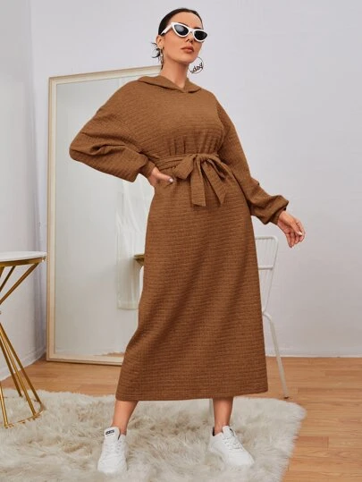 Mulvari Drop Shoulder Solid Belted Hoodie Dress - Brown - View 2