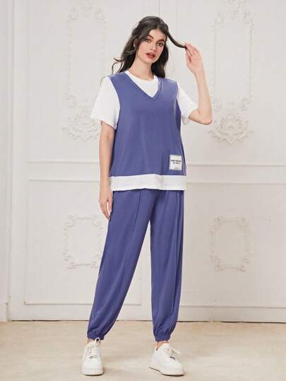 Mulvari Letter Patched Tee & Sweatpants - Purple - View 6