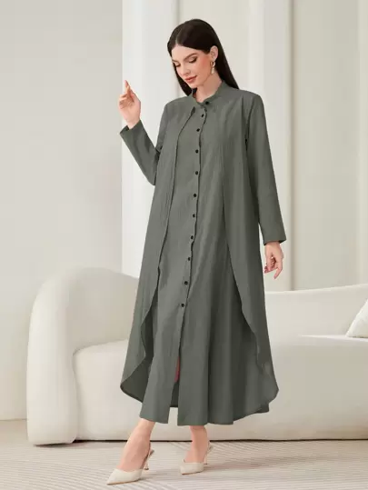 Al Najma Women's Solid Color Loose Arabian Dress With Button Placket - Dark Green - View 1