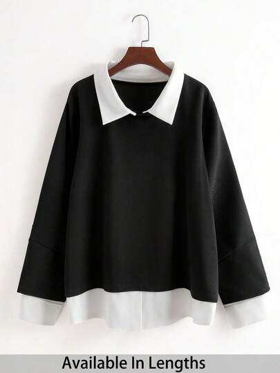 SHEIN PETITE CURVE Plus 2 In 1 Contrast Collar Sweatshirt Graduation,Back To School Outfits,Graduation,Teacher Outfits For Women,Back To School Winter Fall Autumn - Black - View 1