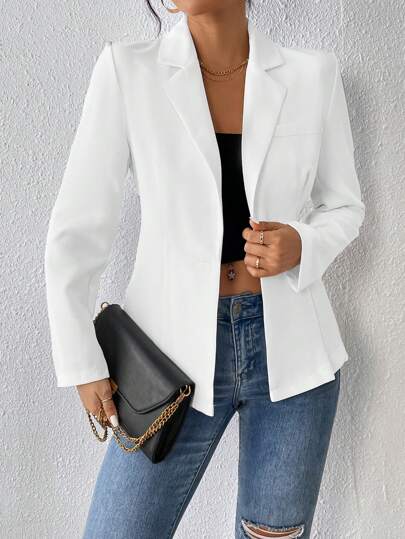 SHEIN PETITE Lapel Neck Single Button Blazer - White - View 1
