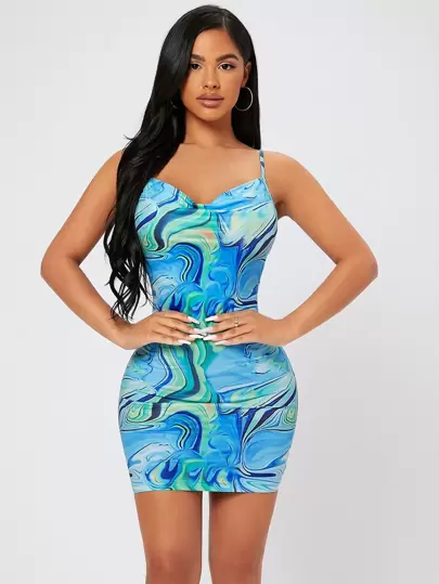 SHEIN PETITE Marble Print Draped Collar Bodycon Dress - Multicolor - View 1