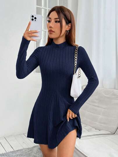 SHEIN PETITE Mock Neck Ribbed Knit Spring Women Dress - Navy Blue - View 1