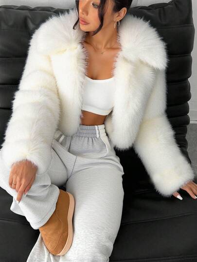 SHEIN PETITE Solid Hook And Eye Placket Fuzzy Coat In Fall/Winter - White - View 1
