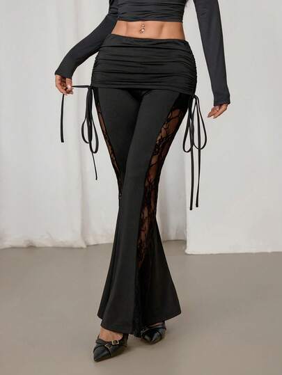 SHEIN PETITE Women's Black Lace Side Splice Waist Drawstring Flare Pants, Sexy & Vacation Style - Black - View 1