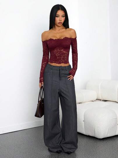 SHEIN PETITE Women's Lace Sexy Sheer Hollow Out Off-Shoulder Long Sleeve Top, Wine Red, Suitable For Christmas, Halloween, Day Of The Dead, Autumn/Winter Layering,Red Top,Christmas - Burgundy - View 1