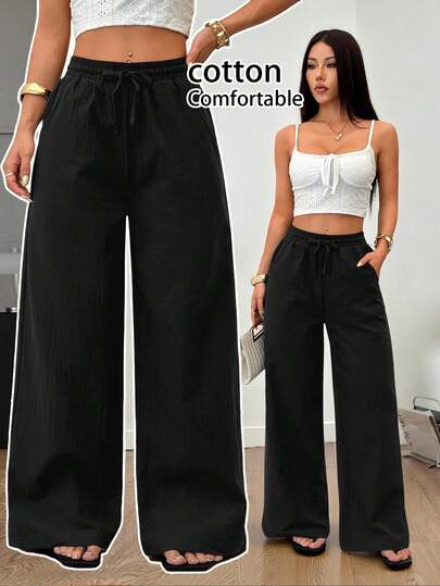 SHEIN PETITE Women's Summer/All-Season Country Concert Going Out Beach Boho Basic Minimalist Washed 100% Cotton Curved Hem Pants Summer Spring  Beach Outfits For Women Casual - Black - View 1