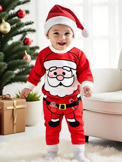 SHEIN Playful Pals 2pcs Set Christmas Santa Claus Costume Baby Boy Kids Red Long Sleeve Sweatshirt And Pants For Party & Baptism - Red - View 1