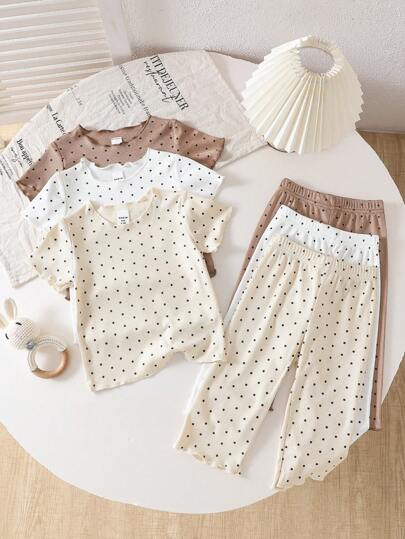 SHEIN Playful Pals Girls Summer Outfit, Baby Girl 3pcs/Set Short Sleeve Thin Polka Dot Versatile Chic Set - Multicolor - View 1