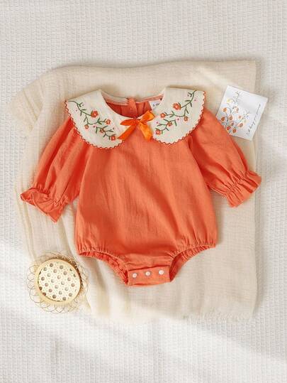 SHEIN Playful Pals Infant Girls' Countryside Embroidered Peter Pan Collar Bowknot Frill Cuff Long Sleeve Bodysuit, Autumn - Orange - View 1