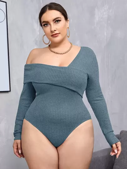 SHEIN Privé Plus Fold Asymmetrical Neck Waffle Knit Bodysuit - Dusty Blue - View 1