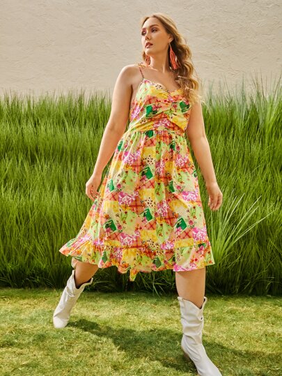 SHEIN VCAY Plus Knot Strap Ruched Front Patchwork Print Cami Dress - Multicolor - View 1