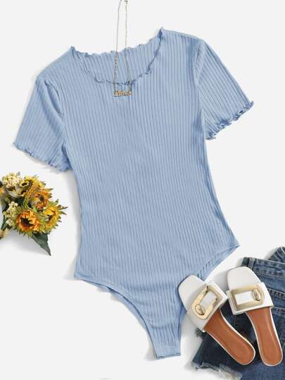 SHEIN EZwear Plus Lettuce Trim Rib-knit Bodysuit - Baby Blue - View 1
