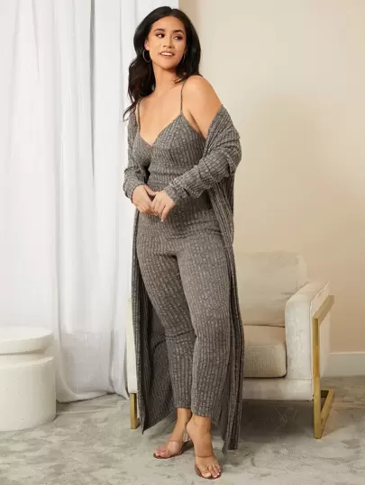 SHEIN Essnce Plus Rib-knit Cami Jumpsuit & Coat - Dark Grey - View 1