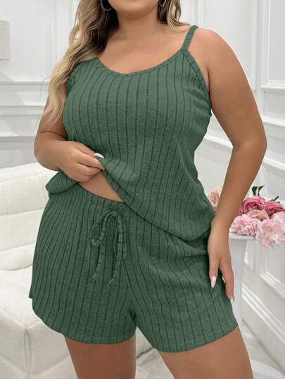 SHEIN Plus Ribbed Knit Cami Top & Knot Front Shorts PJ Set / Pajama Set Lounge Set - Green - View 1