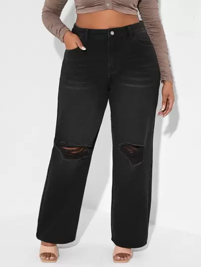 SHEIN Plus Ripped Straight Leg Jeans - Black - View 1