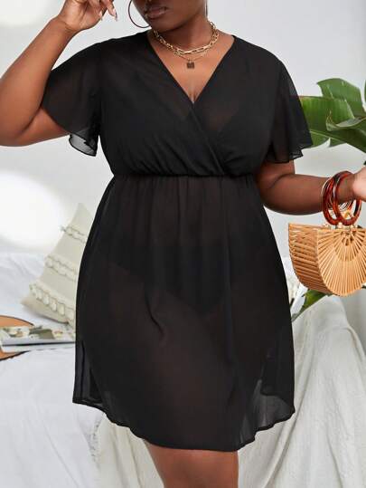 SHEIN Plus Solid Wrap Detail Chiffon Cover Up Dress - Black - View 1