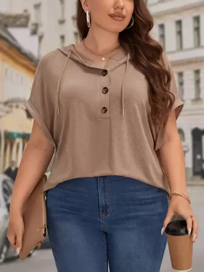 SHEIN LUNE Plus Half Button Batwing Sleeve Drawstring Hooded Tee - Brown - View 1