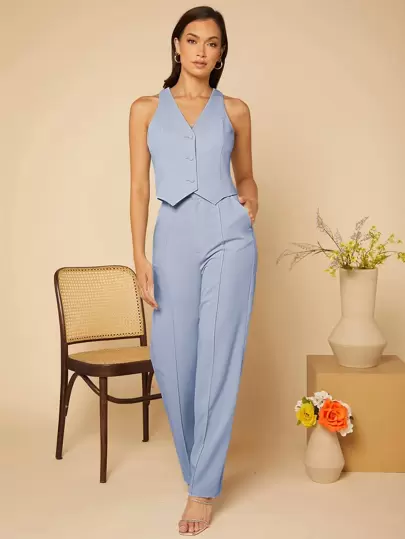 SHEIN Privé Button Front Vest Blazer & Seam Detail Pants - Baby Blue - View 1