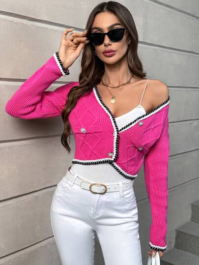 SHEIN Privé Contrast Trim Button Front Crop Cardigan - Hot Pink - View 1