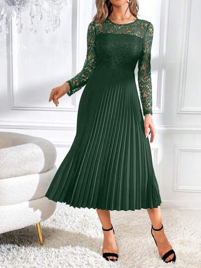 SHEIN Privé Ladies' Lace Splice Pleated Dress - Dark Green - View 1