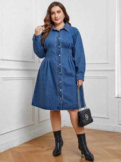 SHEIN Privé Plus Button Front Fold Pleated Detail Denim Dress - Medium Wash - View 1