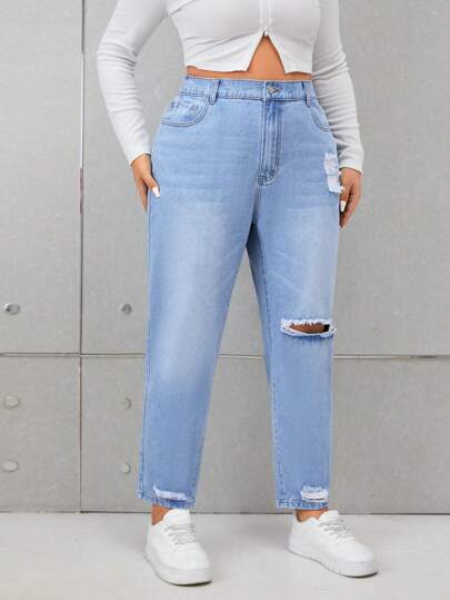 SHEIN Privé Plus High Waist Ripped Mom Fit Jeans - Blue - View 1