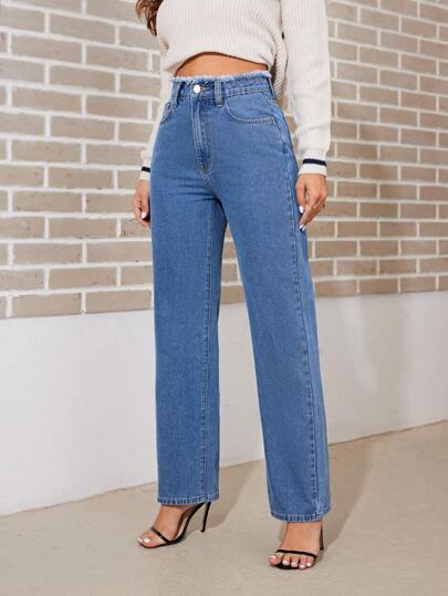 SHEIN Privé Raw Edge Straight Leg Jeans - Medium Wash - View 1