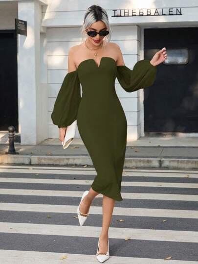 SHEIN Privé Women's Solid Color Off-Shoulder Lantern Sleeve Dress - Green - View 1
