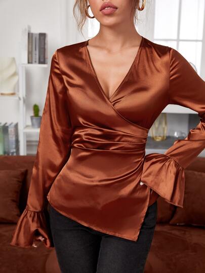 SHEIN Privé Wrap Ruched Side Satin Blouse - Brown - View 1
