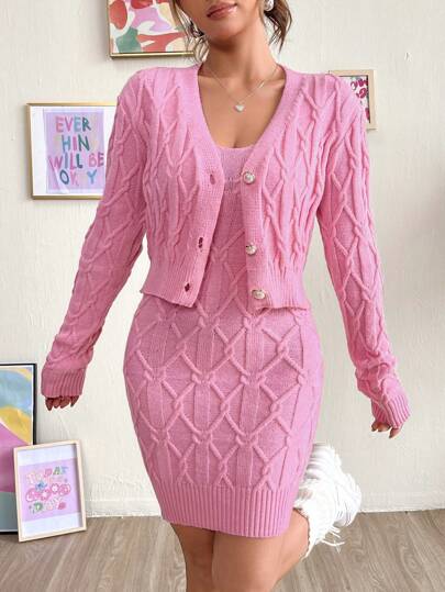 SHEIN Qutie Cable Knit Cardigan & Cami Sweater Dress - Dusty Pink - View 1