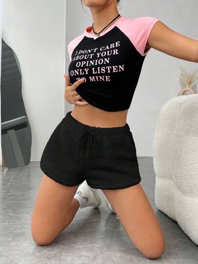 SHEIN EZwear Drawstring Waist Solid Teddy Shorts - Black - View 1