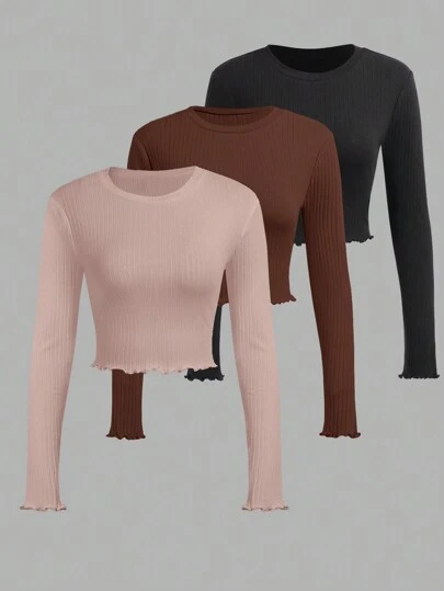 SHEIN EZwear Ladies' Solid Texture Stripe Long Sleeve T-shirt - Brown - View 10