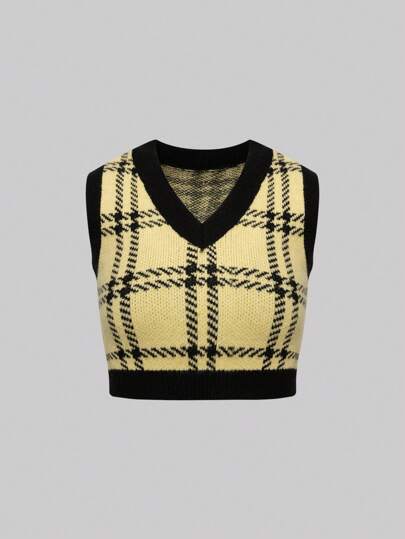 SHEIN Unity Plaid Pattern Sweater Vest - Yellow - View 1