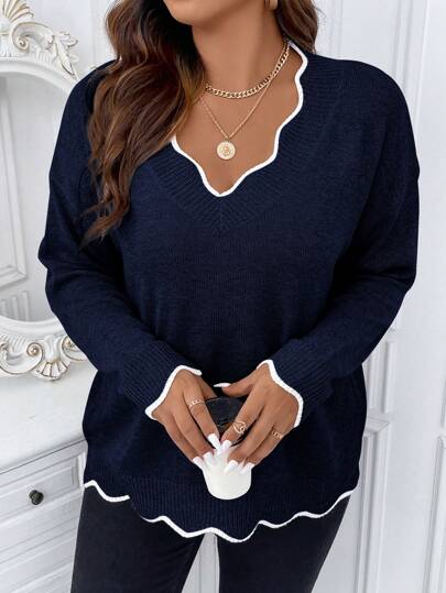 Calvaya Plus Size Contrast Color Wave Trim Long Sleeve Casual Pullover Sweater, For Winter Knit Pullover Fall - Royal Blue - View 1