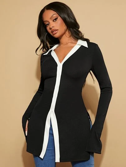 SHEIN SXY Contrast Trim Split Cuff & Hem Button Up Tee - Black - View 1
