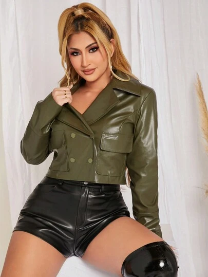 SHEIN SXY Double Breasted Crop PU Leather Jacket - Green - View 1