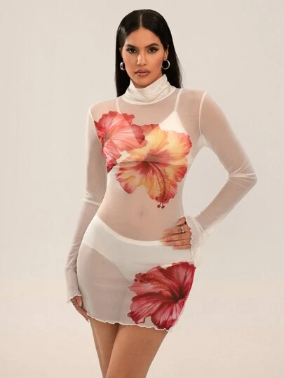 SHEIN SXY Mesh Floral Pattern High Neck Long Sleeve Bodycon Mini Dress - Multicolor - View 1