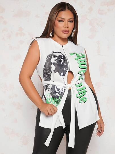 SHEIN SXY Plus Figure & Letter Graphic Tie Front Tank Top - White - View 1