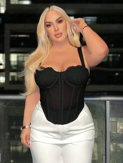 SHEIN SXY Plus Size Solid Color Lace Panel Cami Bustier Top - Black - View 1