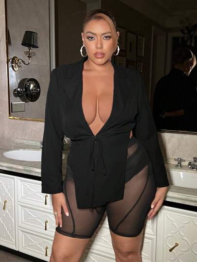 SHEIN SXY Plus Size Turn Collar Asymmetrical Hem Coat And Mesh Shorts Two Piece Set - Black - View 1
