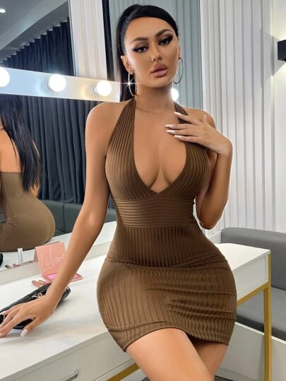SHEIN Allurite Ribbed Knit Backless Halter Bodycon Dress - Mocha Brown - View 1