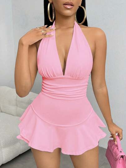 SHEIN SXY Ruched Ruffle Hem Backless Halter Romper - Pink - View 1