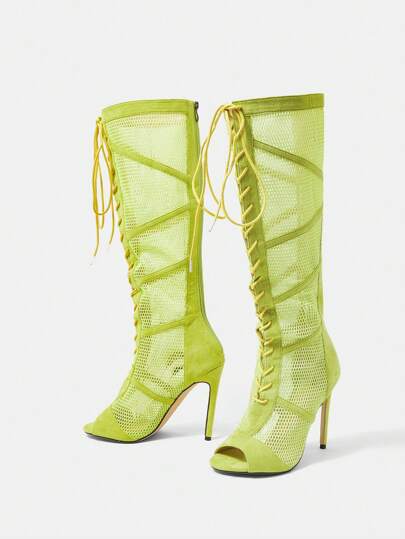 SheIn SXY Women Hollow Design Peep Toe Stiletto Heeled Sandal Boots, Funky Mesh Fashion Boots - Green - View 1