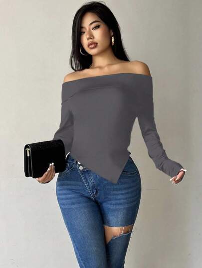 SHEIN Essnce Women's Solid Color Asymmetric Hem Off Shoulder Top - Grey - View 1