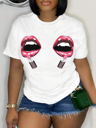Maweii Lip & Lipstick Print Short Sleeve T-Shirt, Women's Slight Stretch Casual Tee Crew Neck Top For Spring & Summer, Women's Clothing - White - View 1