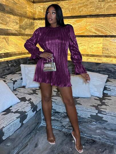 Slaydiva Valentine's Day Dress Music Festival Vacation New Year Clothes Date Elegant And Sexy Girlcult Tight Long Sleeves Ball Women Gown Tea Party Long Sleeve Perple  Women Sxy Semi Formal H Flash Stretch Red Pressed Pleats Drill Dresses - Red Violet - View 4