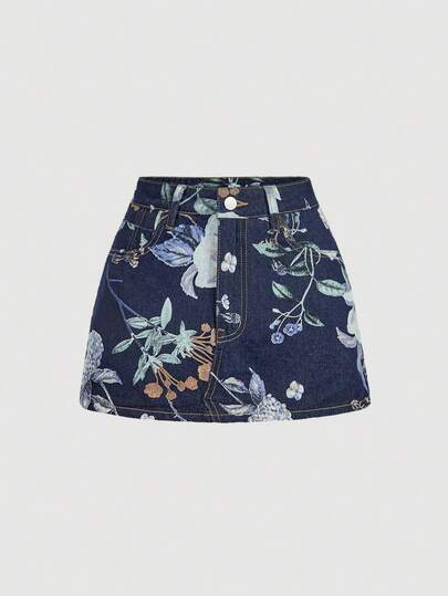 SHEIN Sweetro Casual Floral Print Denim Shorts, Summer - Medium Wash - View 1