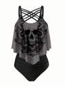 SHEIN Swim Curve Plus Size Summer Beach Skull Print Asymmetrical Hem Spaghetti Strap Top And Ruched Bottom Tankini Set, Perfect For Pool Party, Halloween