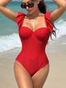 Swim Lushoire Plus Size Women Coconut Tree Printed One-Piece Swimsuit, Flattering Halter, Backless, Waist Cinched, Suitable For Vacation, Scuba Diving, Work For Summer